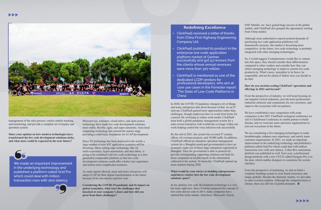 2022年年初,pg试玩在线网站免费入选外媒Insights Success低代码/无代码开发平台 Top10,创始人、CEO胡柏受邀接受专访并荣登封面人物,他与Insights Success的读者分享了pg试玩在线网站免费成立的初心、发展历程、当前的行业发展趋势以及他对公司未来的展望。